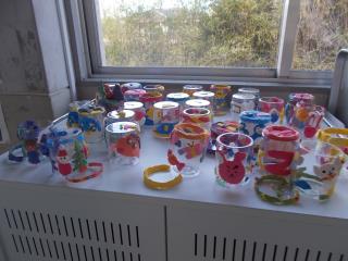 プラスティックの容器に、色々な色の紙粘土をつけて
