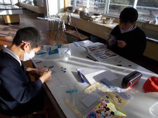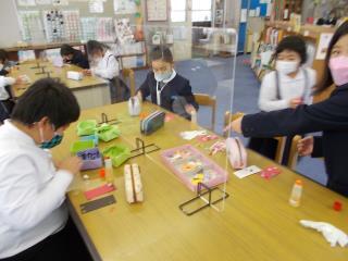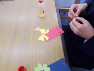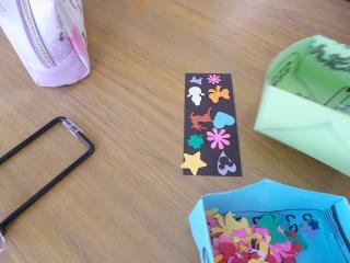 しおりに貼り付けたり、絵を描いたりして仕上げていきます。