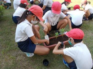 子どもたちは、一つ一つ丁寧に苗を植えていました。