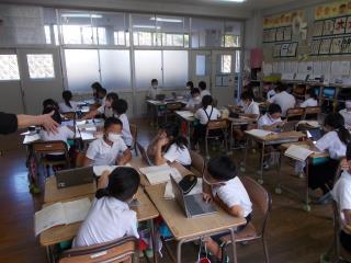 写真は2年生で、パソコンの持ち帰り方についての学習をしているところです。