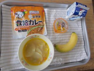 牛乳、みかんゼリー、ラビオリスープ、救給カレー、バナナ