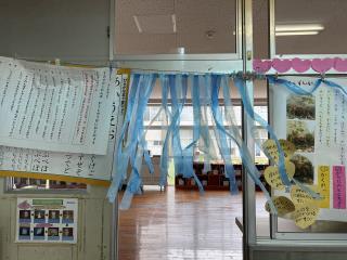 黒板に絵を描いたり、スズランテープで飾り付けをしたりして