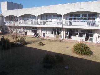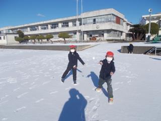 雪が残っている中庭で、子どもたちが元気に遊んでいました。
