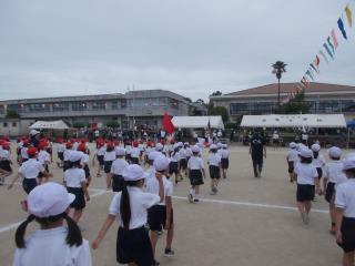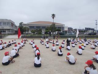 ちょうど雨が雨が降ってきたので、体育館で開・閉開式と応援の練習を行いました。