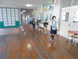 6年生教室では、発表を聴いて、スリッパ並べができているか