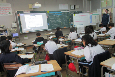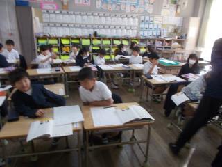 6年生教室では、発表を聴いて、スリッパ並べができているか
