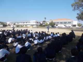 火災報知器の警報の後、放送があり、その後運動場に避難しました。