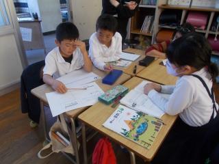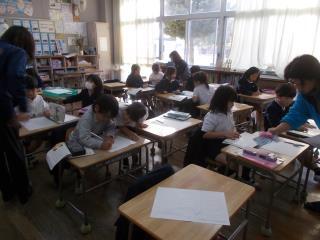 1年生が友達にインタビューしたことを文章にまとめる学習をしていました。