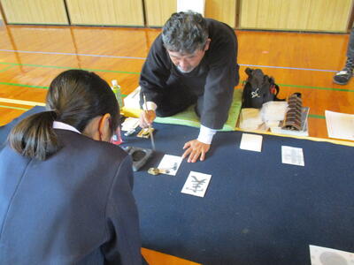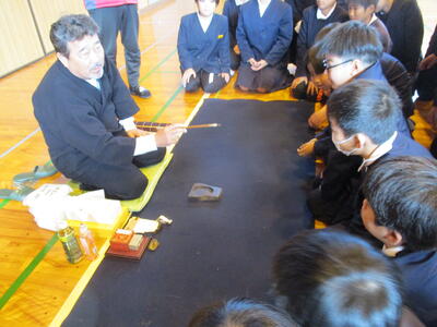 6年生たちの卒業に向けた取組が始まっています。16日には、校区にお住まいの書家、德村剛さん(本校学校運営協議会委員長もされています)にご指導いただき、「お気に入りの1文字」を書に表す卒業制作に取り組みました。書の歴史や道具についてなどプロの方に聴くお話と技に、みんな真剣に楽しく筆をとっていました。