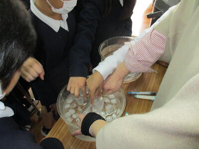 4年担任の山口先生がポットと氷を職員室から教室へ運び込まれていました。何が始まるのかとみていましたら、理科の実験です。空のペットボトル容器を氷水の中に沈めたらどうなるか、温かいお湯に入れたらどうなるかを確かめます。結果は、氷水に入れたら潰れ、お湯に入れたら元のように膨らみます。なぜこんなことが起きるのか・・・目には見えない空気(ペットボトルの中に閉じ込めた空気)の存在と、温度で体積が変わることを学んだ1時間でした。実験の様子を食い入るように見つめる子どもたちの姿がありました。