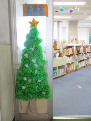 図書室入り口は、すっかりクリスマスの雰囲気。担当の塩﨑先生を中心に本を手に取りたくなる飾り付けがされています。