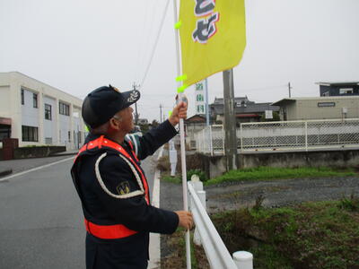 毎週水曜日に朝の登校指導に来てくださっている岡部さん(大野小校区交通指導員)が、交通安全を呼びかけるのぼり旗を2本付けてくださいました。学校前は坂道になっているためスピードが出ている車があり、注意喚起を促したいとの思いから付けてくださいました。