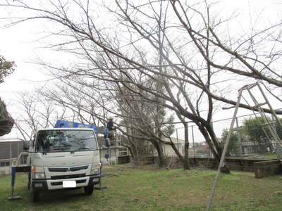 運動場では、大きく育った木の枝が道路や隣家まで伸びていたため、専門の業者さんに来ていただき伐採作業を行っていただきました。枯れている枝も切ってもらい、安心です。