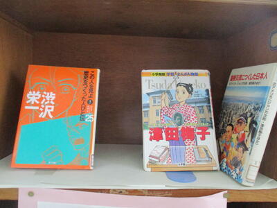 今日から新紙幣が流通を始めることから、図書室前には北里柴三郎さんや渋沢栄一さん、津田梅子さんの伝記を紹介するコーナーが完成。この機会に、どんなことを成し遂げた方々なのかを知りたいですね。塩﨑先生によいきっかけをつくってもらいました。ぜひ手にとってみてください。