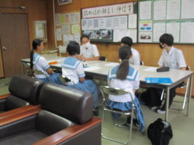 午後から、岱明中学校の2年生が、9月に予定している職場体験の事前打ち合わせに来校しました。弟や妹がいる人も多く、職員室で自己紹介をしてもらったときには、中学生も先生たちも、久しぶりに会えた喜びで笑顔まんかいでした。前田教頭先生と打合せをするときも、緊張感のなかにも和やかな雰囲気がありました。夏休み明け、きっと小学生たちも喜ぶでしょう。よろしくお願いします。