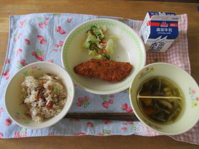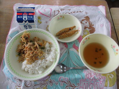 今日の給食のおかずは「あおさ汁、白身魚フライ、レモン和え、たこめし」でした。あおさ・魚・レモン・たこ飯・・・天草地方の特産物ですね。郷土の料理を味わう月に1度の「ふるさとくまさんデー」でした。美味しかったですね。