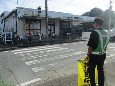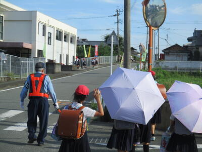 朝から真夏の日差しが照りつける中、今朝も校区内の各地で登校の見守りをしていただきました。毎朝、毎夕本当にありがとうございます。学校近くの交差点でも、子どもたちは見守られながら安全に登校できました。