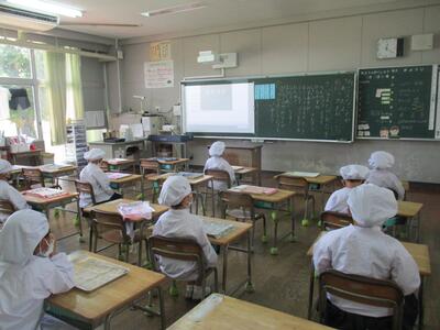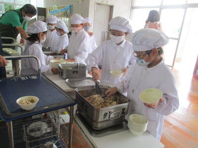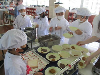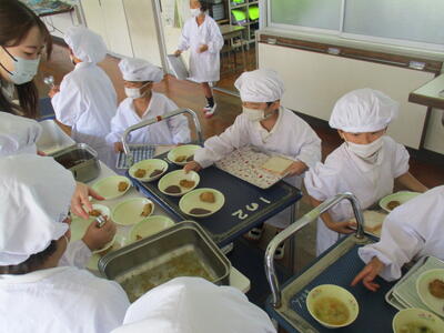 給食の時間、入学当初はすべて先生たちに配膳してもらっていた1年生たち。もうすっかり、ごはんやおかずをついだり、お箸を配ったり、自分たちで給食当番の役割を果たすことができるようになりました。順番を待つ姿勢もピカイチです。子どもたちの成長、すばらしいですね。