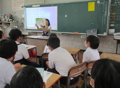 3年生の国語の時間、教室には6年担任の荒平先生と子どもたち。6年生理科、自由研究の授業を向阪先生が担当し、初めての交換授業でした。3年生たちは「引用のルールを知ろう」というめあてのもと張り切って学習に取り組んでいました。引用をする場面、「 」を使って表現すること等の引用のルールを楽しく学ぶことができました。