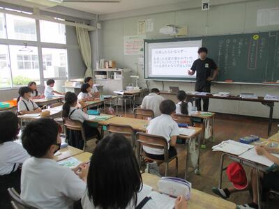 午後から、岱明中学校の2年生が、9月に予定している職場体験の事前打ち合わせに来校しました。弟や妹がいる人も多く、職員室で自己紹介をしてもらったときには、中学生も先生たちも、久しぶりに会えた喜びで笑顔まんかいでした。前田教頭先生と打合せをするときも、緊張感のなかにも和やかな雰囲気がありました。夏休み明け、きっと小学生たちも喜ぶでしょう。よろしくお願いします。