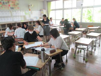 子どもたちがお互いのことを大切に思いみんなで楽しく学び合うことができるには、どのような授業づくりをしていくことが大切かについて、先生たちは研修をしました。今日は市田先生がリーダーとなって、研修を進行します。子どもたちと同じように、先生たちもお互いの意見を出して話し合うことでいろいろなアイデアが出てきて、みんなで学び合うことができました。夏休みはこうして先生たちも勉強を続けます。こつこつ、みなさんと一緒です!!