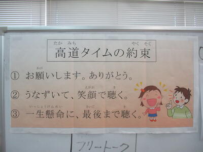 週に1回、朝活動の時間に取り組んでいる「高道タイム」。「行ってみたい国」や「今、はまっていること」等のお題に沿って自分のことを語り、友だちの話を聴き、お互いをよく知り合おうという活動です。ペアで話したり、3人組、4人組になったり、いろいろな人と話せることも楽しみの一つで、よりよいコミュニケーションの取り方を学ぶ時間でもあります。