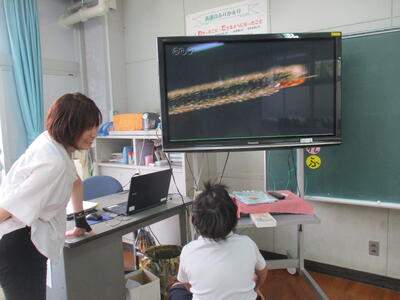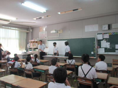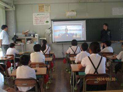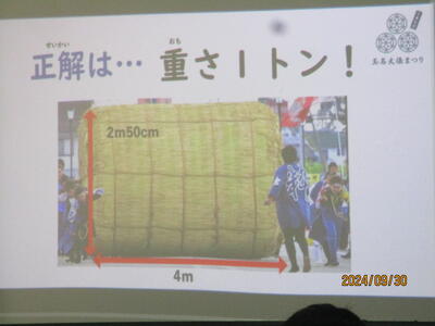 午後は、6年生たちが大俵まつりの歴史を学ぼうと、玉名観光協会・大俵まつり実行委員会から講師の先生に来ていただきました。11月のまつりに向けて練習を始めた6年生たち。菊池川河口にある玉名市は、江戸時代から菊池川流域の米の集積地として栄えていたこと、舟に米を積み込む際「高瀬船着場跡」の石畳の坂を利用していたこと、その坂が今は「俵ころがし」と呼ばれていることにちなんで大俵ころがしレースが考えられたとのことでした。動画を見せてもらったり、大俵が1トンもの重さがあること等を知ったりして、興味深く学びました。玉名の繁栄と五穀豊穣に感謝するまつり。練習にもますます力が入りそうですね。講師の先生方、ありがとうございました。
