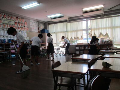 また、掃除時間には「たてわり掃除」が始まりました。昨年度から再開した取り組みで、異年齢の集団で活動することで、子どもたちの人間関係を育んでいこうとするものです。担当の先生と6年生たちのリードで掃除場所を確認し、さっそく掃除開始。上級生が下級生をやさしくリードする姿がみられました。みんなで協力して取り組みましょう。