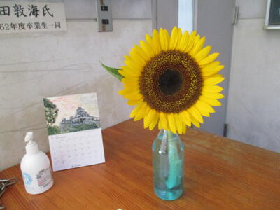 今週も大野校区の交通指導員の岡部さんが登校指導にきてくださいました。朝から元気に子どもたちを迎えていただくので、子どもたちも元気なあいさつを返すことができます。今日は大輪のヒマワリの花も持ってきてくださいました。玄関がパッと明るくなりました。いつもありがとうございます。