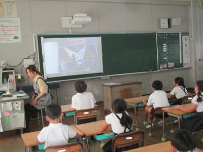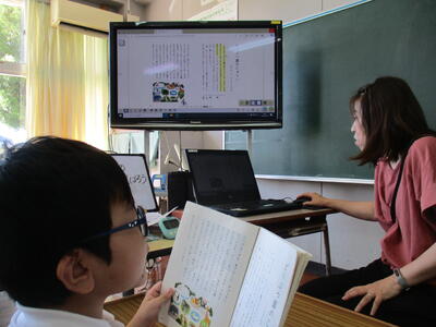 1年生の朝活動の時間、フッ化物洗口のあとに山口先生が絵本の読み聞かせをしてくださっていました。昨日に引き続きの読み聞かせ。1年生たちは静かに絵本を見つめています。表情豊かに話される山口先生の語り口に引き込まれ、お話の世界を楽しんでいました。あおぞら教室に戻ってからは、ひらがなの表を歌いながら覚える練習をしたり、映像を見ながらたくさんの言葉に触れたり、いつも楽しく賑やかに学習が進んでいます。