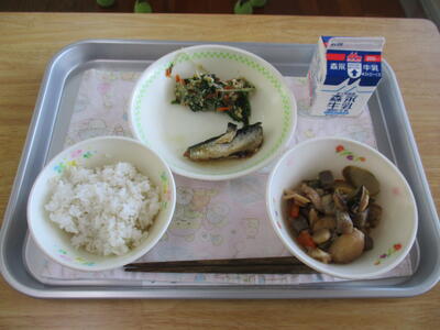 今日の給食のおかずは「筑前煮、イワシの生姜煮、納豆和え」でした。歯ごたえのある根菜類がたっぷり入った筑前煮、ホウレンソウともやしがたっぷり入った納豆和え、今日はいろんな野菜がたっぷりでした。