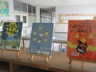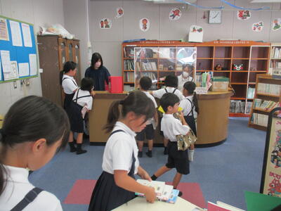 登校後、ランドセルの片付けが終わると、図書室へ向かう人がたくさんいます。特に1年生が多く、毎日のように借りにきている人もいます。図書委員さんや塩﨑先生に確認してもらいながら貸し出しを終え、ほくほく顔で教室へもどっている様子をみると、こちらまで嬉しくなります。秋を感じさせてくれる絵本が紹介されていたり、しおりコンテストに応募した人の作品が飾られていたり、どうぞ、皆さんも図書室へ足を運んでみてください。お家の方々からお子さんにリクエストされるのも楽しそうです。