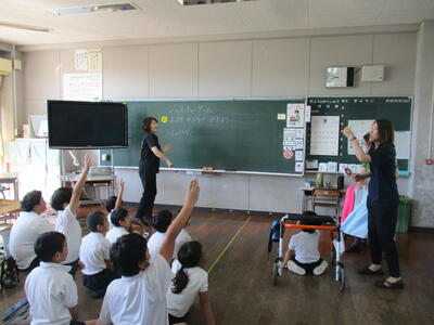 週明けの1時間目、あおぞら4組からにぎやかな声が聞こえてきました。あおぞら学級合同の授業で、みんなでジェスチャーゲームをしているところでした。はじめに、前田先生と山口先生がゲームの進め方を示し、2人ずつ交代しながら前に出てきてジェスチャーをしました。すぐに答えがでる時もあれば、なかなか出ないときもあり、みんなで盛り上がりました。想像力を働かせ言葉にしていく楽しさで、笑顔いっぱいの時間でした。