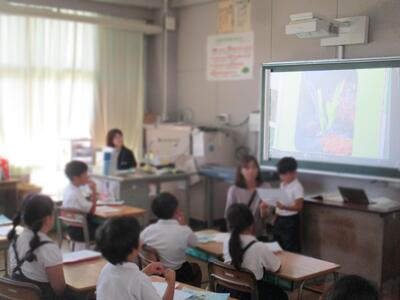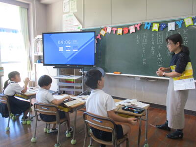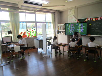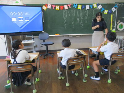 朝晩はずいぶん涼しくなりました。あおぞら4組の教室は秋模様。アイデア豊富な前田先生手作りのブドウやクリの掲示物が秋の訪れたを感じさせてくれ、心がほっこりします。国語の学習ではデジタル教科書が駆使され、集中して音読練習やフラッシュカードでの漢字練習に取り組んでいました。いろいろな活動を組み立て、いつも楽しく学べる工夫をされています。
