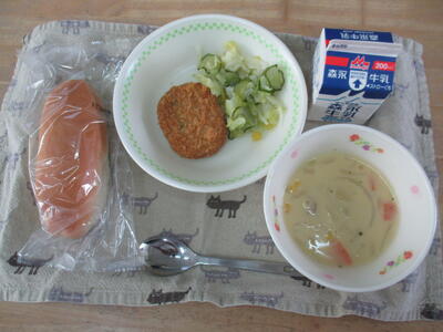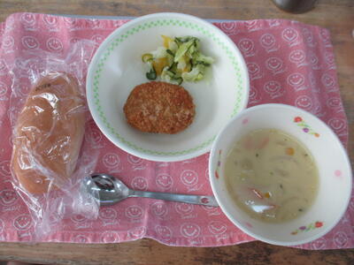 今日の給食のおかずは「野菜スープ、ハンバーグのきのこソースかけ、果物のヨーグルト和え、丸パン」でした。パンにハンバーグをはさんだり、ヨーグルト和えをはさんだり、おいしさを楽しみながらいただきました。