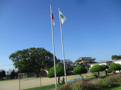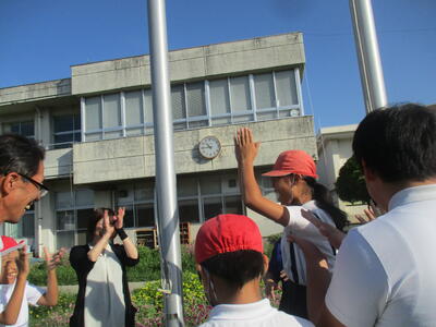 昨年から構想をしていた高道小キャラクター「くすのっきー」の旗が完成し、初掲揚の朝を迎えました。しかし、ひもがほどけず悪戦苦闘すること約10分。教頭先生がドライバーでほどいてくださって、運営委員会さんたちの大きな拍手と笑顔に包まれ空高く掲げることができました。高道の子どもたちの心の拠り所になってくれそうです。委員さん、先生方ありがとうございました。