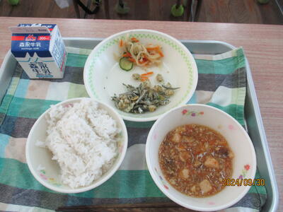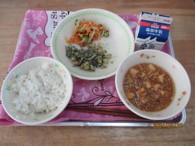 今日の給食のおかずは「麻婆豆腐、だいずといりこの青のりがらめ、ナムル」でした。給食の麻婆豆腐は辛すぎることなく、ご飯にかけて食べる人が続出の一品です。ごちそうさまでした。