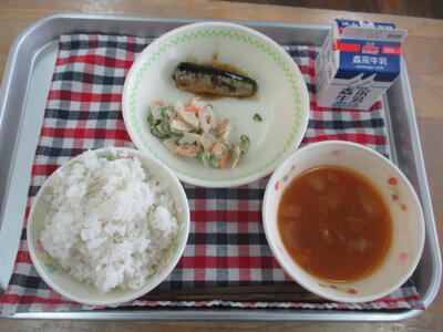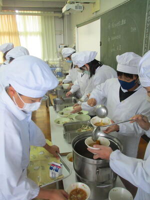 今日の給食のおかずは「カボチャとろけるキムチすいとん、イワシ梅煮、レンコンサラダ」でした。ほんのりキムチの味がして、体の芯からあたたまるスープでした。5年生の給食当番さん、テキパキと上手でした。