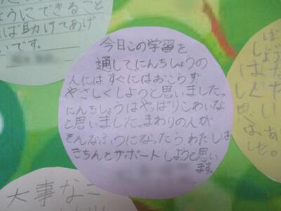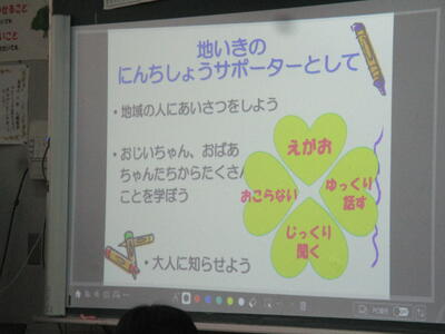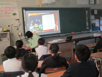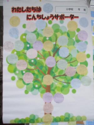 2,3校時には、玉名市包括支援センターから4人の講師の方々をお迎えして、4年生たちが認知症サポーター養成講座を受講しました。スライドを使って、認知症とはどんな状態かをわかりやすく教えていただきました。認知症の患者さんの行動を具体例を出して説明されたので、4年生たちにも理解できたようです。後半は、認知症のことを知り、サポーターとして自分にどんなことができそうかをカードに書き、みんなの思いを集めたツリーが出来上がりました。正しく理解することが、優しい気持ちをもって人と接することにもつながるのですね。大事なことを教えていただきました。講師の先生方、ありがとうございました。