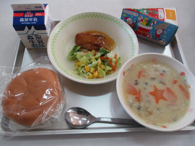 今日の給食のおかずは「サツマイモの豆乳入りシチュー、ローストチキン、カラフルサラダ、ケーキ」クリスマスメニューが並びました。シチューには、星形のニンジンが入っていました。