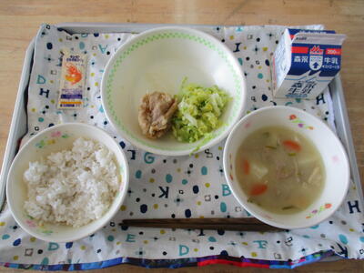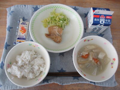 今日の給食のおかずは「根菜の味噌汁、チキン南蛮、千切りキャベツ、タルタルソース」でした。れんこんやゴボウなど、歯ごたえのよい野菜がごろごろ入っていました。