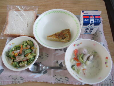 今日の給食のおかずは「冬野菜シチュー、さつまいもスペイン風オムレツ、こんにゃくサラダ、食パン」でした。シチューにはブロッコリーやカリフラワー、ニンジンといった定番野菜だけでなく、大根が入っていました。トロトロとやわらかくなっていました。