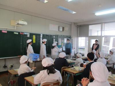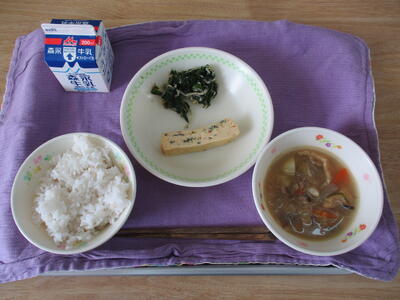 今日の給食のおかずは「だご汁、ちぐさ焼き、梅かつお和え」でした。手でこねられただごは、とてもやわらかくて優しい味でした。手の込んだ一品、ごちそうさまでした。