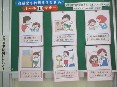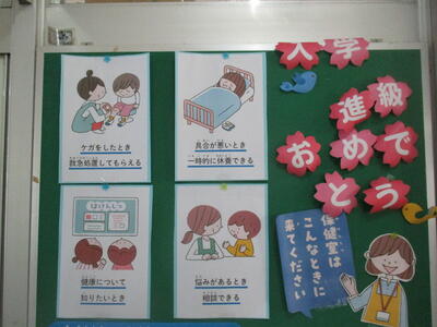 保健室の掲示版には、新学期を迎えて清田先生からのメッセージが並びました。みんなよく読んでいるので、よい使い方ができそうです。