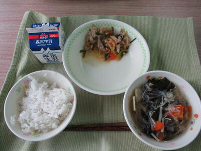 今日の給食のおかずは「春雨スープ、豚肉のキムチ炒め」でした。キムチは辛みがおさえてあるので、おいしかったです。豚肉パワーをいただきました。