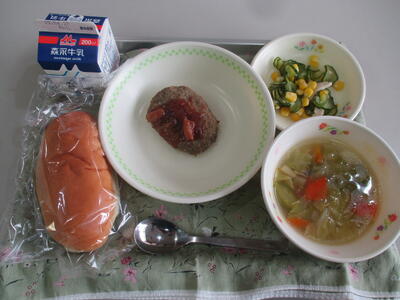 今日の給食は「コッペパン、野菜スープ、ハンバーグきのこソース、コーンサラダ」でした。毎週水曜日のパンの日を楽しみにしている人も多いようです。ハンバーグはふっくらしていて、美味しかったです。