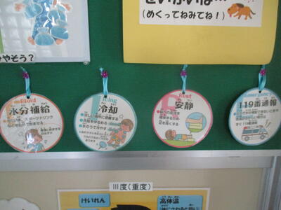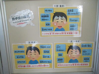 養護の清田先生手作りの掲示物をみて、ワイワイ先生と話をしている2年生たちを発見。この時期にぜひ知ってほしい【熱中症】をテーマにした掲示物で、どこで休んだらいいかな、体のどこを冷やせばいいかなと氷の袋を動かしながら考えていました。