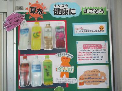 また、暑い夏に飲みたくなる清涼飲料水には、たくさんの砂糖が入っていることを知った上で、飲む量を考えよう!とメッセージされています。季節に合わせて、子どもたちに健康な生活について考えるきっかけづくりがされている保健室掲示版。学校においでになったときに、ぜひご覧ください。大人もたっぷり学べて楽しめます!