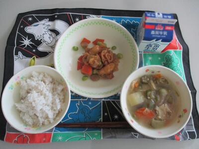 今日の給食のおかずは「茄子の味噌汁、チキンチキン根菜」でした。今月の味噌汁には、今が旬の茄子が入っていました。チキンと根菜の歯ごたえがよく、美味しい献立でした。ごちそうさまでした。