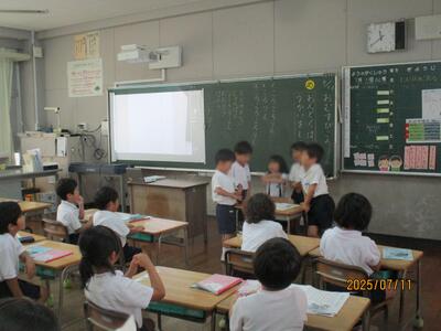 4校時、1年生たちは「おむすびころりん」の音読発表会でした。班ごとに役割を決めて、役になりきってセリフを言ったり動きをつけたりして表現していました。発表する人も聞いている人も楽しい発表会。最後に感想を伝え合い、大きな拍手に包まれました。とても上手でした。